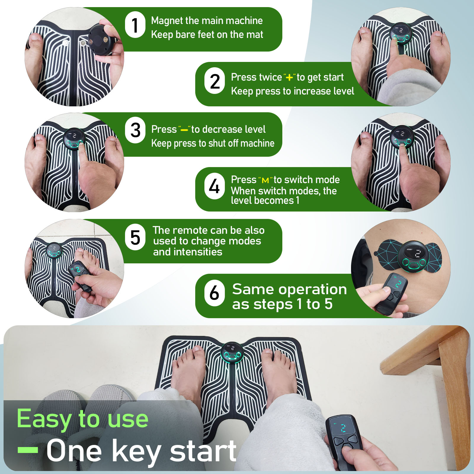- Easy to Use:Simply connect the main unit to the mat and press the “+” button to power on. If there’s no further operation within 10 seconds, the device will shut off automatically—this is a built-in safety feature, not a malfunction. Press “+” to adjust intensity and “M” to switch modes