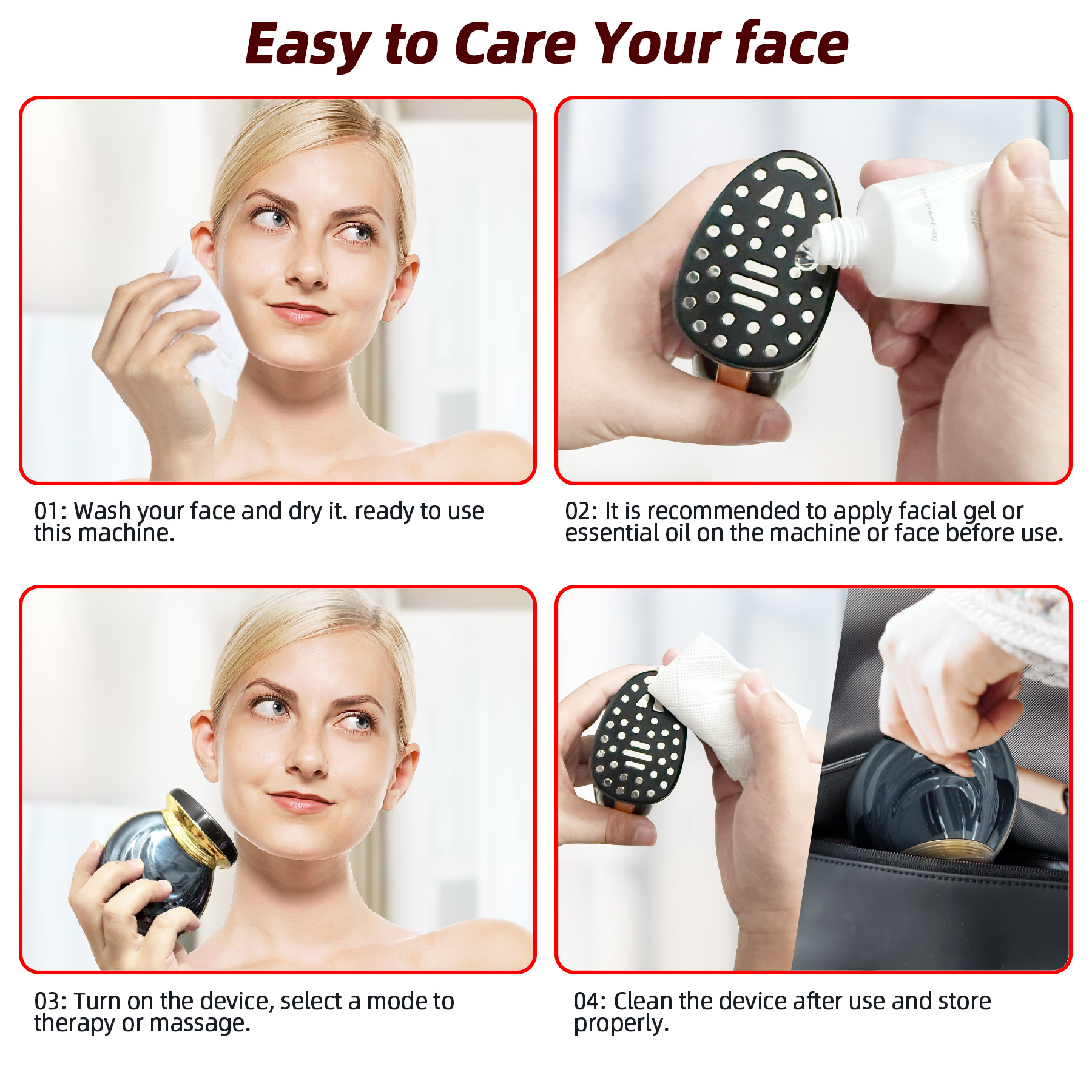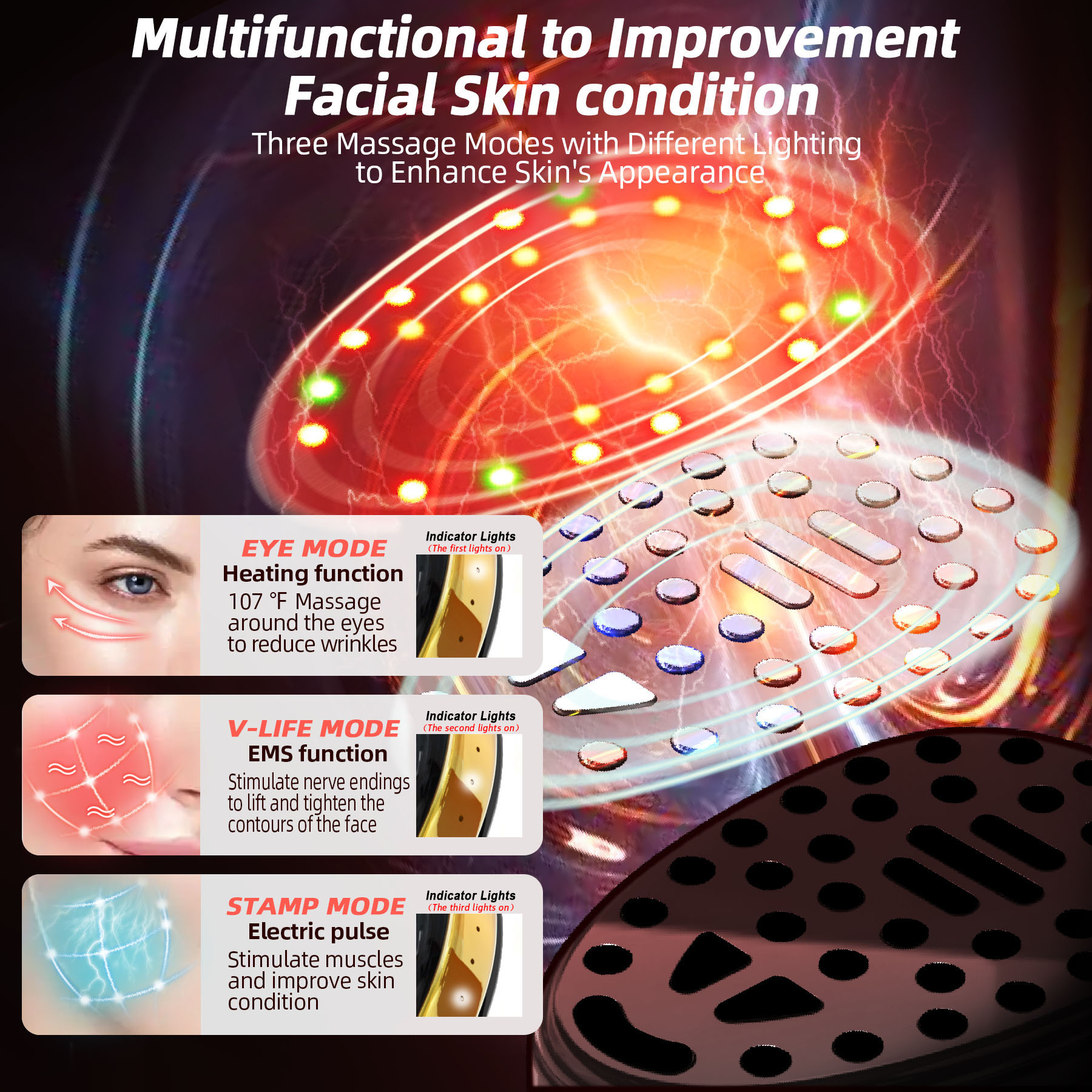 - 3 Modes Facial Massager: EYE mode for skin care around eyes (with heating). V-LIFT mode for lift and tighten the contours of the face (without heating). STAMP mode for full face skin care (without heating). Use this face massager 6 to 10 minutes per day,5 or 6 times a week is more better. Do not use on the area within the eye socket, such as the eyeball, upper eye face, etc. Lips (including upper and lower lips) and the inside of the mouth