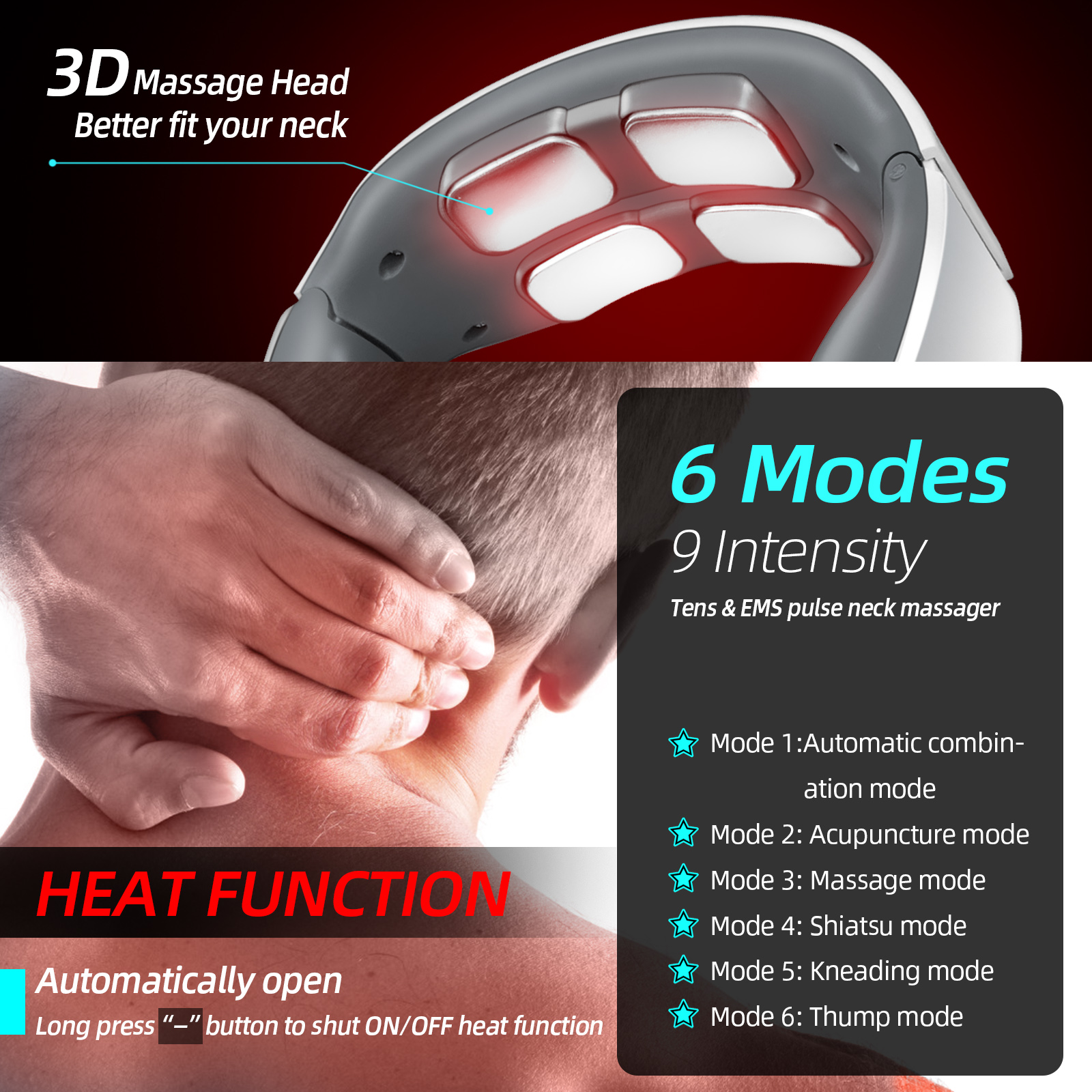 - Multiple Modes and Intensity:The cordless neck massager designs with 10 different modes and 15 intensities .It is normal if you feel an electric shock when you use it for the first time. We recommend starting from the lowest level to meet your different needs