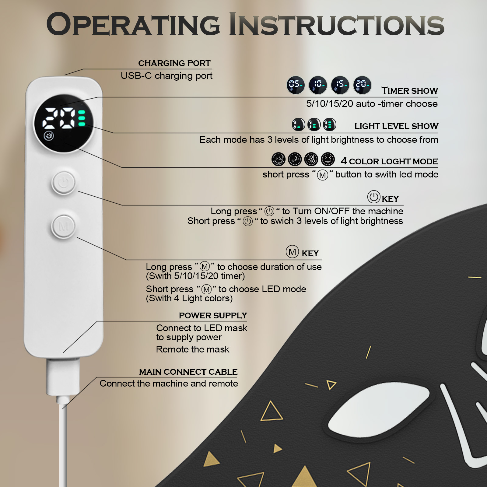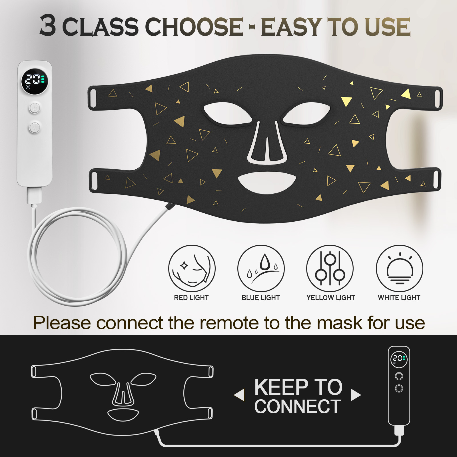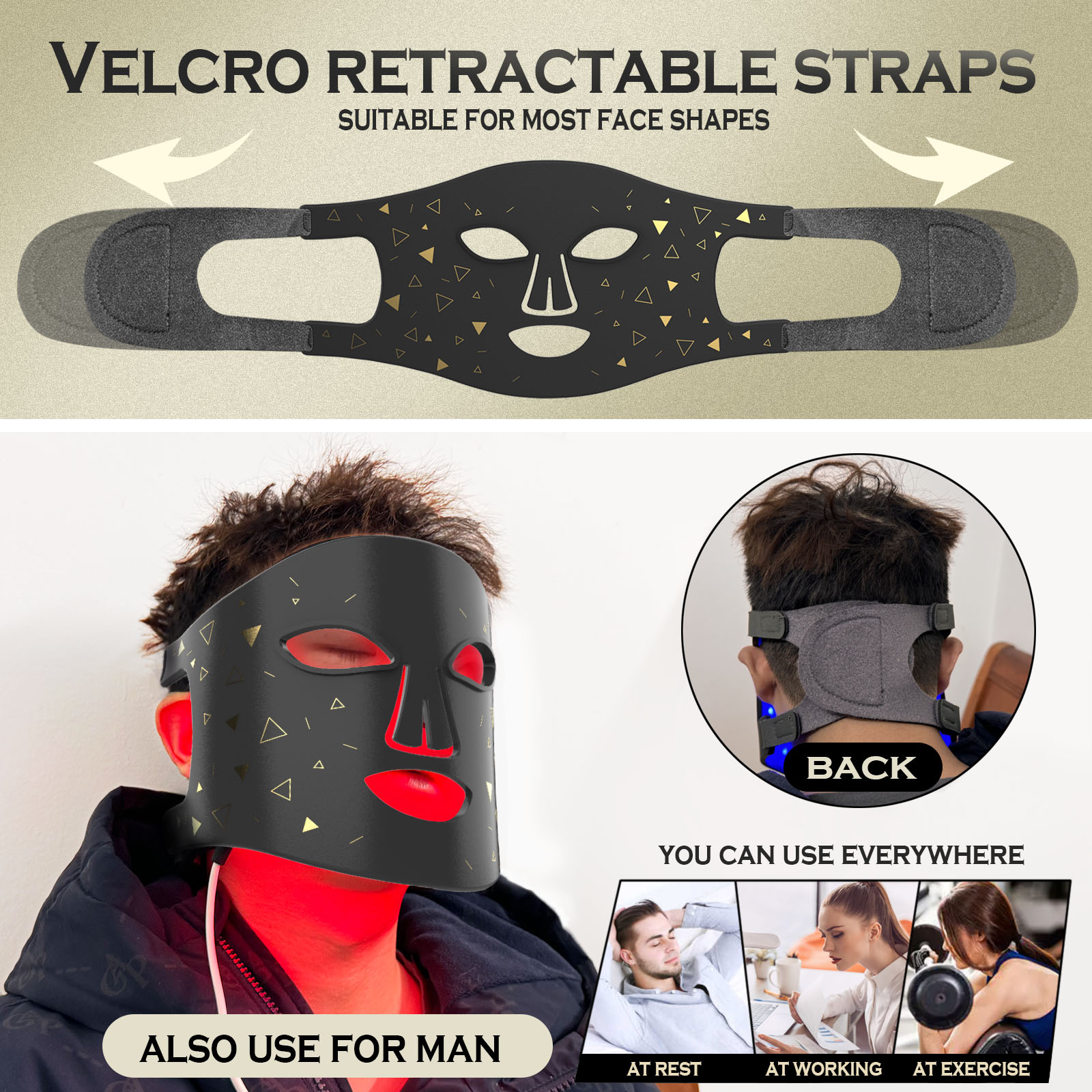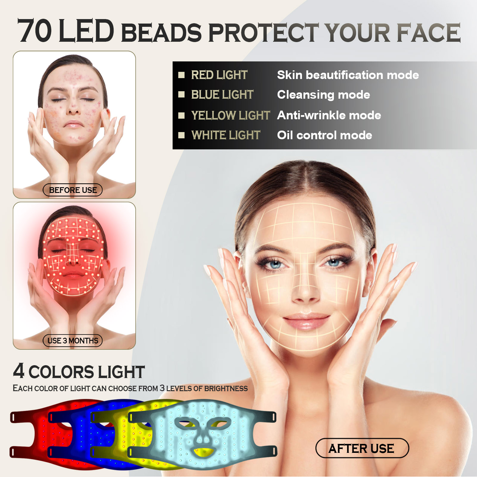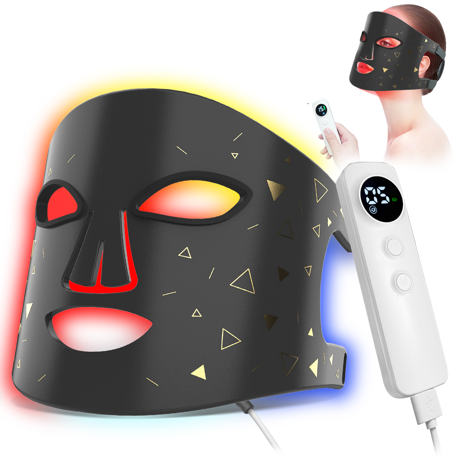 • Multi-Wavelength LEDs: Our light therapy facial mask built-in LEDs emit a combination of red, blue, and other colored LEDs to diminish the appearance of wrinkles, and blemishes.With different color settings, you can customize your treatment to target specific concerns, from reducing wrinkles to improving skin tone and texture